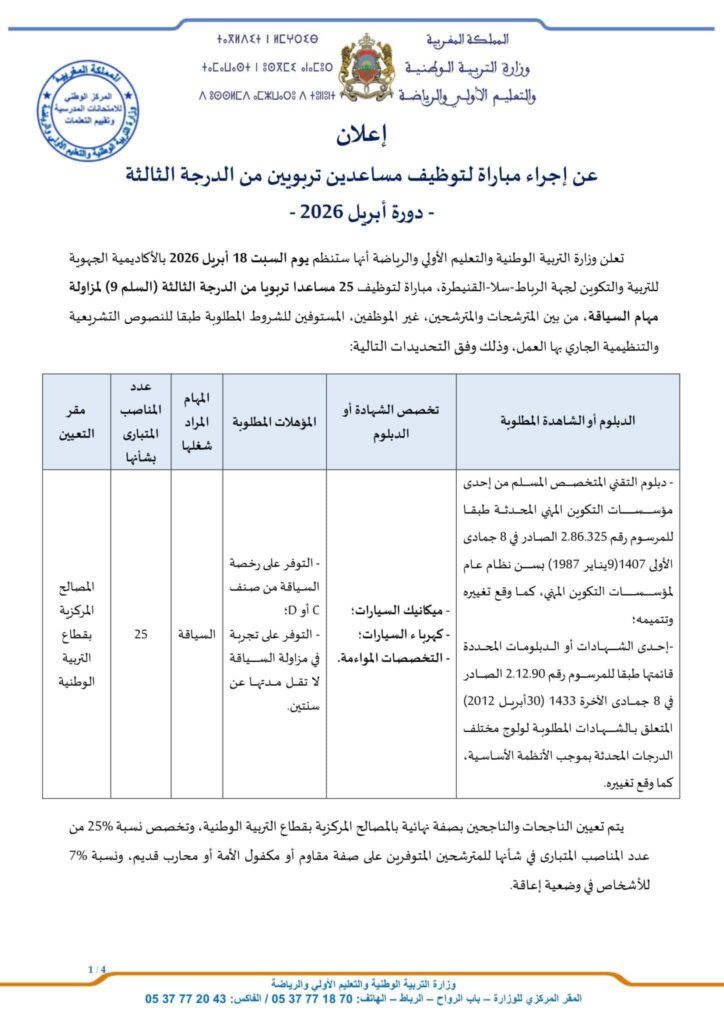 Consultez aussi : Concours de Recrutement Gendarmerie Royale pour l’année 2026