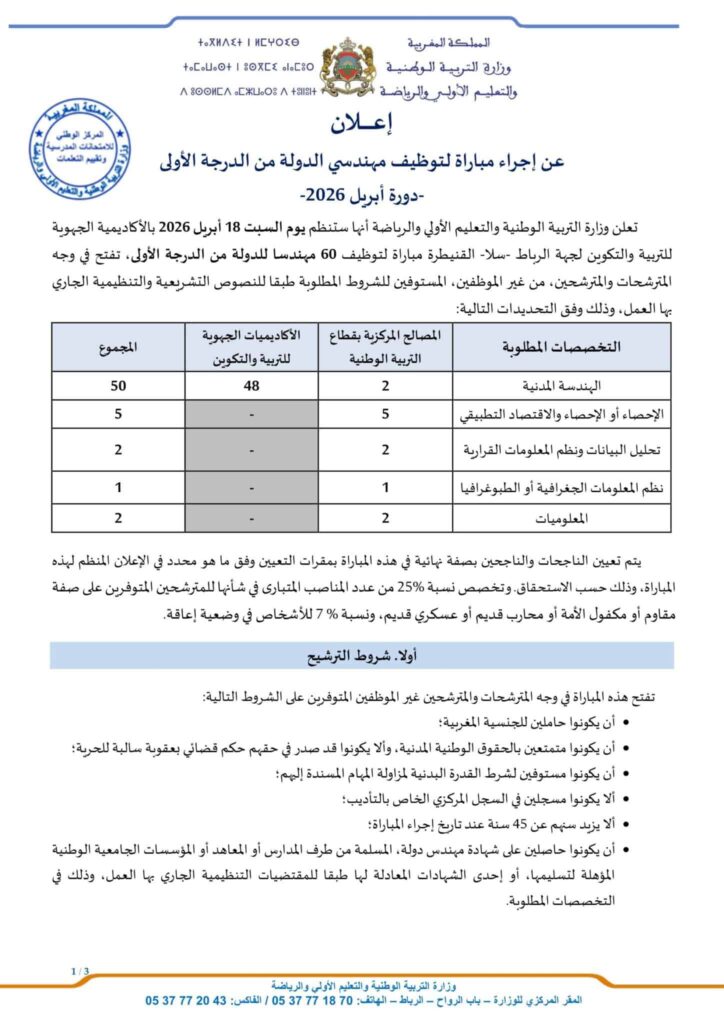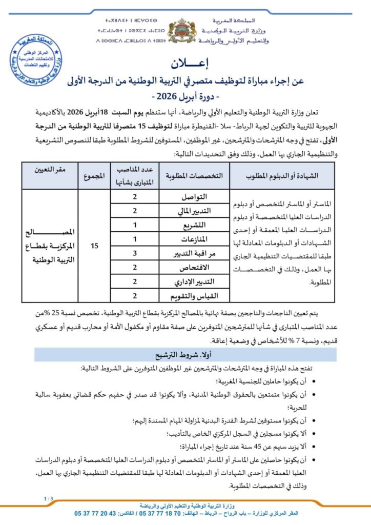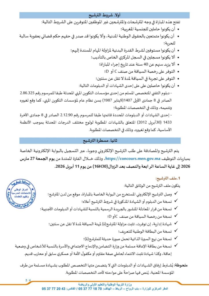 Royaume du MarocMinistère de l’Éducation Nationale, de l’Enseignement Préalable et des SportsConcours de Recrutement Date limit